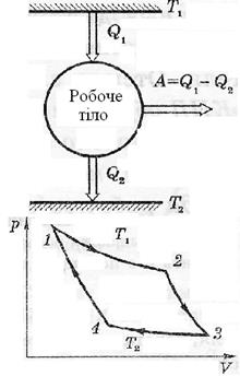 Теоретичні відомості. Карно розглянув тепловий двигун, який складається з нагрівача з температурою Т1, холодильника з температурою Т2 і робочого тіла