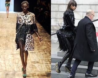 Эти материалы часто используют в отделке (рис. 6). Перья, к примеру, придают легкости и невесомости. Бахрома же делает пальто более массивным по виду, многослойным и необычным. [1] Рисунок 6 – Пальто, декорированные бахромой и перьями