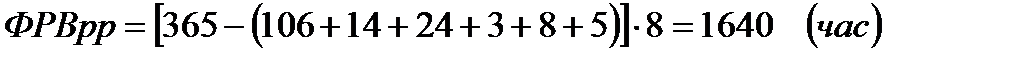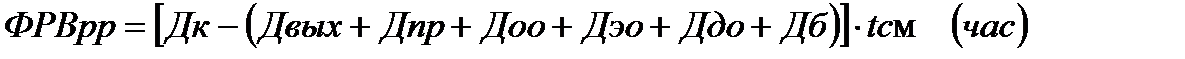 Дк-дни календарные (365) Двых-дни выходные (106) Дпр-дни праздничные (14) Доо-дни основного отпуска (24) Дэо-дни экологического отпуска (8) Ддо-дни дополнительного отпуска для участков с вредными условиями труда (3) Дб-дни по болезни (5) tсм-время смены (8 час)