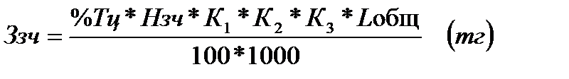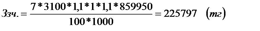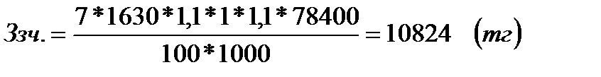 %Тц процент трудоемкости цеха 7% Нзч- норма затрат на запасные части К1-коэфицент, учитывающий категорию эксплуатации=1, 1 К2- коэффициент, учитывающий марку подвижного состава: =1 К3=коэффициент, учитывающий природно-климатические условия=1, 1 Lобщ-общий годовой пробег автомобиля
