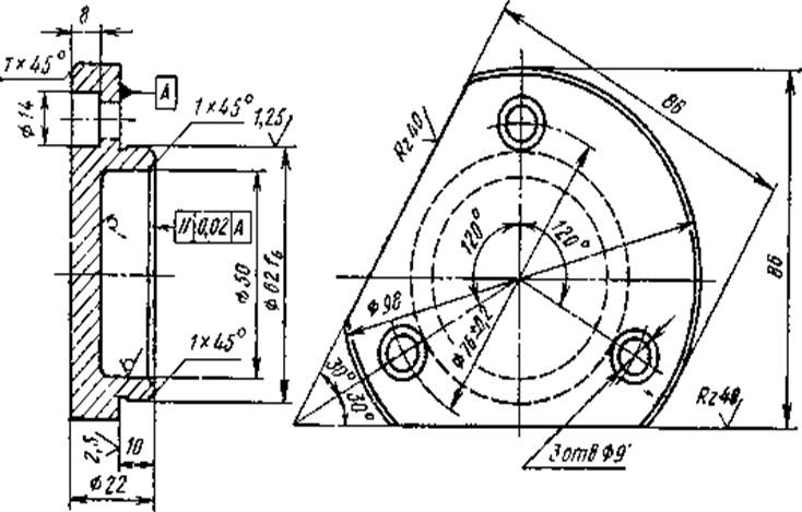 45. Основное служебное назначение фланцев заключается в ограничении осевого перемещения вала, установленного на подшипниках в изделии (машине), путем создания необходимого натяга или гарантированного осевого зазора между торцом фланца и торцом наружного кольца подшипника. Кроме того, фланцы выполняют роль крышек отверстий под валы, создавая необходимое уплотнение. Конструкции фланцев весьма разнообразны, однако все они к корпусу крепятся винтами и, как правило, с утопленными головками. По техническим требованиям точность цилиндрической поверхности центрирующего пояска выполняется не выше чем по 7-му квалитету, а параметр шероховатости поверхности Ra = 1, 25... 2, 5 мкм. Во избежание перекоса подшипника в процессе затяжки фланца винтами для обеспечения натяга (или требуемого зазора) допуск взаимного расположения поверхности торцов фланца устанавливают достаточно малым. В зависимости от серийности выпуска в качестве заготовок для фланцев применяют отливки (чугунные и стальные), поковки и штампованные заготовки, а также диски, отрезанные от сортового прутка.