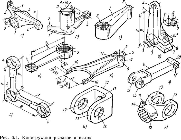 Вилки переключения 8 (рис. 6.1, ж) предназначены для изменения кинематических и динамических связей машин путем осевого возвратно-поступательного передвижения муфт, зубчатых колес и других подобных деталей. Такие вилки 8 с обеих сторон имеют плоские исполнительные поверхности 10, посредством которых при переключении передачи достигается контакт с сопряженными деталями с одной стороны вилки 8 по всем поверхностям 10. Для обеспечения минимального перекоса вилки 8 ее нужно базировать в механизме по основной базе — высокоточному отверстию 3 по двойной направляющей базе. Для этого вилка 8 должна иметь бобышку 11 значительной длины. Чтобы вилка 8 могла выполнять свое служебное назначение, ее исполнительные поверхности должны быть перпендикулярны к оси отверстия 3. Базирование и закрепление вилки 8 в угловом и осевом положениях осуществляются посредством отверстия 9, расположенного в бобышке так, что его ось перпендикулярна к оси отверстия 3. Вилки шарнирных соединений подвижных деталей машин (рис. 6.1, з—к) для выполнения ими служебного назначения снабжают ушками 13 с соосными обычно цилиндрическими отверстиями 12 для базирования по двойной направляющей базе соединительных шарнирных осей. Базирование самой вилки 8 также 418производится по двойной направляющей базе по хвостовику 15 (см. рис. 6.1 у к) с шлицевой, резьбовой, конической или цилиндрической наружной или внутренней поверхностью либо по бобышке 16 с отверстием 17 (см. рис. 6.1, и), ось которого перпендикулярна к осям отверстий 12 в ушках 13 (см. рис. 6.1, и, к) или параллельна им (рис. 6.1, а). Эти вилки обычно закрепляются на деталях благодаря упругой деформации хвостовика 17 (см. рис. 6.1, к) при затяжке резьбовых деталей в отверстии 6 бобышки 14. Для увеличения упругой податливости в вилке часто прорезают паз шириной (4 ± 0, 2)... (6, 5 ± 0, 2) мм с параметром шероховатости поверхностей Rz 40 мкм. Особенность конструкции поворотных кулаков заключается в том, что соосные отверстия, подобные отверстиям 12 вилок шарнирных соединений (см. рис. 6.1, к) расположены, как правило, не под прямым углом к оси конического хвостовика с цилиндрическими посадочными ступенями под подшипники.