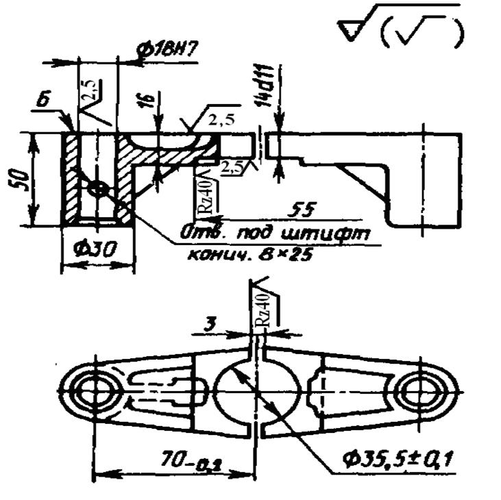 53. В зависимости от служебного назначения детали ее отверстия, служащие основными и вспомогательными базами, должны быть изготовлены в пределах допусков Н6—Н11, а отклонения межосевых расстояний не должны превышать ±(0, 05... 0, 50) мм. Оси отверстий для вспомогательных баз детали должны быть параллельны или соответственно перпендикулярны оси отверстия — основной базе; допустимые отклонения от 0, 02: 100 до 0, 10: 100. Для обеспечения прилегания торцов бобышек рычагов и вилок шарнирных соединений к сопряженным деталям и снижения контактных напряжений эти торцы должны быть перпендикулярны к осям соответствующих отверстий; допустимые отклонения от 0, 1: 100 до 0, 3: 100, а параметр шероховатости их поверхности Ra — 0, 32... 1, 25 мкм. Исполнительные поверхности рычагов переключения для обеспечения требуемого сопряжения с поверхностями передвигаемых деталей должны быть перпендикулярны к оси отверстия — основной базе; допустимые отклонения от 0, 05: 100 до 0, 10: 100, а параметр шероховатости поверхности Ra = 0, 63... 2, 5 мкм; для рычагов — коромысел клапанов — от Ra = 0, 63 мкм до Rz = 40 мкм. Параметр шероховатости поверхности отверстий Ra = 0, 63...2, 5 мкм, а отклонение от их формы — обычно в пределах допуска на диаметр. Для увеличения срока службы твердость исполнительных поверхностей этих деталей устанавливают HRC9 40—50... 50—55.