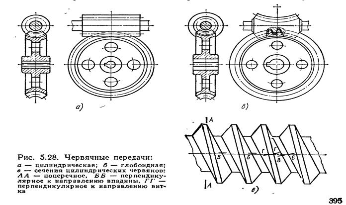 Конические зубчатые колеса изготовляют из углеродистых сталей: закаливаемых (сталь 40, сталь 45) и цементуемых (сталь 15, сталь 20) или легированных закаливаемых D0Х) и цементуемых B0Х), хромоникелевых A8ХГТ, 20ХНМ). Заготовки в зависимости от программы выпуска получают штамповкой, ковкой или в виде круглого проката. Червячные передачи. В машиностроении применяют цилиндрические и глобоидные червячные передачи. Цилиндрические передачи имеют червяк, осевое сечение которого представляет собой рейку с прямолинейными или криволинейными боковыми сторонами (рис. 5.28, а). Глобоидные передачи имеют червяк, осевое сечение которого представляет собой круговую рейку с прямолинейными боковыми сторонами (рис. 5.28, б). Цилиндрические передачи по форме винтовой поверхности делят на четыре вида. 1. Архимедова червячная передача имеет червяк, у которого профиль боковой поверхности витка в поперечном сечении АА (рис. 5.28, в) представляет собой архимедову спираль. В осевом сечении ББ архимедов червяк имеет прямолинейный профиль, а в сечении /Т, перпендикулярном к направлению витка, — криволинейный. 2. Эвольвентная червячная передача имеет червяк, у которого профиль боковой поверхности витка в поперечном сечении АА имеет форму эвольвенты. В осевом сечении ББ и сечении, перпендикулярном к направлению витка /Т, эвольвентный червяк имеет криволинейный профиль. Прямолинейный профиль витка червяка получается в сечении плоскостью, касательной к основному цилиндру. 3. Конволютная передача имеет червяк, у которого профиль боковой поверхности витка в поперечном сечении АА представляет собой удлиненную эвольвенту. В сечении, перпендикулярном к направлению витка ГГ или впадины ВВУ конволютный червяк имеет прямолинейный профиль. 4. Нелинейные червяки имеют во всех сечениях криволинейный профиль.