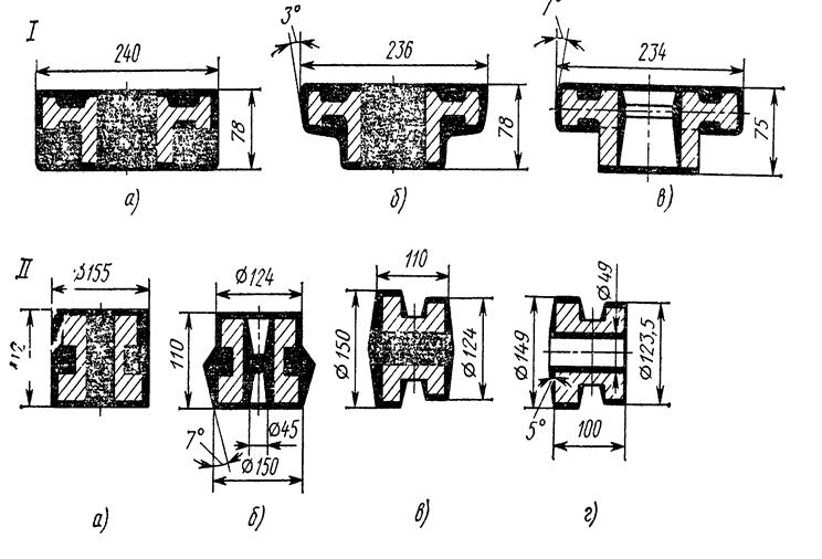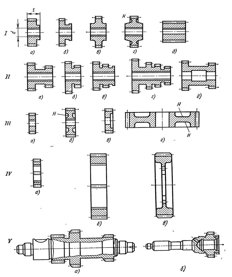 / — одновенцовых колес; а — поковка; б — штамповка в подкладном штампе; в — штамповка в закрепленном штампе; // — двухвенцовых колес; а— поковка; б — штамповка на молоте в торец; в — штамповка на молоте вдоль оси; г — штамповка на горизонтально-ковочной машине 61. При обработке заготовок зубчатых колес на токарно-револьверных станках в массовом и крупносерийном производстве применяют стандартные пневматические и гидравлические патроны.