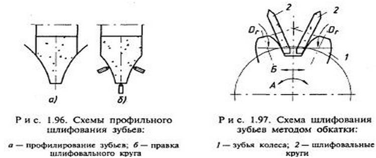 63.Чистовая обработка зубчатых колес включает зубошлифование, хонингование, притирку, полирование, шевингование, обкатывание и приработку. Чистовая обработка зубчатых колеспроизводится для повышения точности элементов зубчатого венца и улучшения шероховатости боковой поверхности зубьев. Чистовая обработка зубчатых колеспосле термообработки производится шлифованием профиля зубьев на шлифовальных станках. Базой для установки на станок обычно служат центровые отверстия в зубчатых колесах. Притирка позволяет производитьчистовую обработку зубчатых колеспосле термической обработки. Различают две схемы притирки: на параллельных осях одним притиром и на скрещивающихся осях тремя притирами. Между притиром (чугунное колесо) и обрабатываемым колесом вводится смесь абразивного порошка с маслом. Когда к зубчатому колесу предъявляются высокие требования в отношении точности и чистоты обработки его зубьев, после зубонарезания производится отделочная обработка. Шевингование является одним из наиболее распространенных методов отделочной обработки сырых цилиндрических колес. Для обработки прямозубых цилиндрических колес обычно применяются косозубые дисковые шеверы, представляющие собой закаленные зубчатые колеса, имеющие на боковых поверхностях зубьев не глубокие канавки, образующие режущие кромки. Создание методов отделочной обработки зубьев направлено на повышение качества зубчатых колес и передач, а также производительности обработки. Шлифование зубьев зубчатых колес — наиболее надежный метод отделочной обработки, обеспечивающий высокую точность, как правило, закаленных зубчатых колес. Шлифование зубьев производят на различных зубошлифовальных станках как методом копирования, так и методом обкатки.