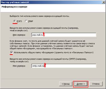 Рис. 4. 2-й крок: у наступному вікні оберіть як сервер вхідної пошти POP3. В якості сервера для вихідної пошти (Outgoing mail server) Ви можете вказати SMTP-сервер Вашого провайдера (його ім'я Ви можете дізнатися в службі підтримки користувачів Вашого провайдера). Якщо Ви вже налаштовували обліковий запис в цій поштовій програмі, то за замовчуванням буде використовуватися вже існуючий сервер вихідної пошти (SMTP). Ви можете змінити параметри SMTP-сервера вибравши пункт «Параметры учётной записи» в меню «Инструменты». Після заповнення полів натисніть «Далее».