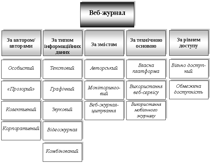 Рис.2. Класифікація веб-журналів За автором/авторами: Особистий. Веб-журнал ведеться від імені однієї особи. Наприклад, автором веб-журналу є викладач. На сторінках такого веб-журналу можуть бути подані програма курсу, дидактичні матеріали курсу, домашнє завдання, або опис власного життя, міркування стосовно питань освіти, дискусії. Викладач може задавати запитання студентам, а студенти відповідати, додаючи нові коментарі. Автором веб-журналу може бути студент. Він публікує власні розробки, реферати, короткі статті або результати виконаної практичної роботи. Веб-журнал цього типу може використовуватися як журнал для письмових завдань. Тут є позитивний виховний момент: публікація у веб-журналі вчить відповідати за свої слова, відстоювати свою позицію, оскільки написане може бути опротестоване іншими учасниками. Такий вид організації роботи в мережі вимагає особливо багато часу й зусиль від педагога, який повинен переглянути веб-журнали студентів. «Прозорий» веб-журнал – ведеться від імені невідомої особи. Колективний веб-журнал – ведеться групою осіб за правилами, визначеними автором веб-журналу. Наприклад, авторами веб-журналу є викладач і студенти. В такому випадку студенти мають більше можливостей, що стимулює їх навчальну діяльність. Корпоративний веб-журнал – ведеться працівниками однієї організації. Наприклад, авторами веб-журналу можуть бути викладачі одного навчального закладу або вчителі однієї школи. Оскільки веб-журнал може мати декілька підрозділів, відповідно вести кожен з них може окремий учасник. Підрозділ «Інформатика» веде вчитель інформатики, підрозділ «Математика» – вчитель математики і т.д. За типом інформаційних даних: Текстовий веб-журнал – основні інформаційні дані – текст. Використовується для опису власних думок, вражень або теоретичних положень свої дисципліни і т.д. Графічний веб-журнал – основні інформаційні дані – графічні (малюнки, фотографії, схеми, діаграми, презентації і т.д.). Наприклад, даний тип веб-журналу можна використати для збереження графічних зображень, які потрібні для виконання практичної роботи, або для публікації фотографій класу чи окремих учнів (веб-журнал як дошка пошани). Звуковий веб-журнал – основні інформаційні дані – звукові. Цей тип веб-журналу може містити не лише музичні записи, але й записи проведених уроків чи лекцій, практичних занять та інші навчальні звукові матеріали. Відеожурнал – основні інформаційні дані – відеозаписи. Цей веб-журнал може містити різноманітні навчальні відеоматеріали – наприклад, відеофрагменти найкращих уроків для навчання майбутніх вчителів інформатики або відповіді студентів, приклад розв’язування задачі чи проведення лабораторного досліду і т.д. Комбінований веб-журнал – сукупність різних видів інформаційних даних – текстових, графічних, звукових, відеоданих. За змістом: Авторський веб-журнал – публікації належать автору веб-журналу. Моніторинговий веб-журнал – публікації інших авторів. Автор публікує розробки інших авторів за їх згодою. Веб-журнал цитування – розміщуються цитати з інших веб-журналів. Викладач може робити збірку таких цитат і висловлювати свою власну позицію щодо тієї чи іншої думки, стимулювати обговорення різних повідомлень серед студентів і т.д. За технічною основою: Використання власної в