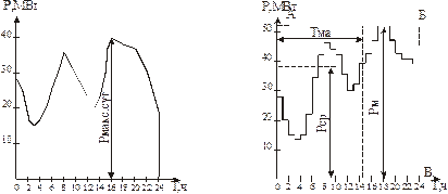 Для характеристики работы установки в течение года достаточно иметь суточные графики для наиболее характерных суток года. Для большинства установок наиболее характерными суточными графиками нагрузок являются зимний (конец декабря) и летний (конец июня) суточные графики. Зимний график обычно соответствует наибольшим нагрузкам установки в течение года (наибольший расход на электроосвещение, на отопление), а летний – наименьшим, хотя могут быть и исключения (водонасосные станции, холодильные установки и т.д.). На действующих предприятиях суточные графики строят по записям показаний счетчиков активной и реактивной энергии, производимым через каждый час. Для суточного графика (рис. 1.2) характерны следующие величины: 1) максимум активной P м и Q м реактивной мощности (это наибольшая по графику нагрузка длительностью не менее получаса); 2) коэффициент реактивной мощности максимума, соответствующий cosjм: