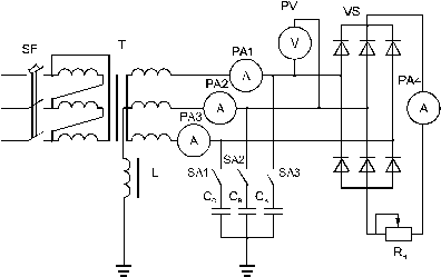 Описание лабораторного стенда На стенде (рис. 4.3) имеются измерительные приборы и выводы трансформатора, реактора, конденсаторных батарей. Источником высших гармоник является шестифазный вентильный преобразователь (трехфазная мостовая схема выпрямления). Реактор предназначен для включения в нейтраль трансформатора. Индуктивность реактора можно менять регулированием тока подмагничивания. Нагрузкой для шестифазного преобразователя являются реостаты, установленные на столе стенда. Для фиксирования осциллограмм токов и напряжений имеется осциллограф. Вход осциллографа включается на шунт, которым служит соединительный провод.