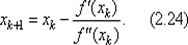 Таким образом, для одинакового уменьшения значения ln в методе средней точки нужно вычислить вдвое меньше значений производной функции по сравнению с числом значений самой функции в методе дихотомии. Метод Ньютона. Если строго унимодальная на отрезке [ а, b ] функция f (x) дважды непрерывно дифференцируема на этом отрезке, то точку x *∈ [ а, b ] минимума этой функции можно найти путем решения уравнения f '(x) = 0 методом Ньютона, иногда называемым методом касательных. Пусть x 0∈ [ а, b ] — нулевое приближение к искомой точке x *, называемое обычно начальной точкой. Линеаризуем функцию f '(x) в окрестности начальной точки, приближенно заменив дугу графика этой функции касательной в точке (x 0, f '(x 0)): f '(x) ≈ f '(x 0) + f ''(x 0)(x – x 0). (2.23)