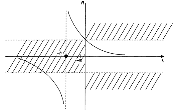 При невыполнении условия h > m система (5.25) может оказаться вырожденной. Кроме этого слева от точки λ = – т функция релаксации быстро входит в запрещенную область, и метод может стать расходящимся. Попытки использования алгоритмического способа более точной локализации h приводят к необходимости многократного решения плохо обусловленной линейной системы (5.25) с различными пробными значениями h. Легко видеть, что число обусловленности матрицы При выборе заведомо больших значений h, что реализуется, например, когда определяющим в (5.26) является первое выражение в скобках, мы имеем m < < h, и величина | R (– m)| ≅ 1, что приводит к медленной сходимости. Ограничение снизу на величину h не позволяет также уменьшить до желаемой величины множители релаксации для λ > 0. Эти трудности усугубляются при аппроксимации производных конечными разностями, так как при малых значениях
