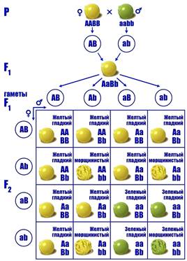 Организмы отличаются друг от друга по многим признакам. Поэтому, установив закономерности наследования одной пары признаков, Г.Мендель перешел к изучению наследования двух (и более) пар альтернативных признаков. Для дигибридного скрещивания Мендель брал гомозиготные растения гороха, отличающиеся по окраске и форме семян (желтые гладкие и зеленые морщинистые). Скрещивая растение с желтыми и гладкими семенами с растением с зелеными и морщинистыми семенами, Мендель получил единообразное гибридное поколение F1 с желтыми и гладкими семенами. Следовательно, желтая окраска (А) и гладкая форма (В) семян – доминантные признаки, зеленая окраска (а) и морщинистая форма (в) – рецессивные признаки.