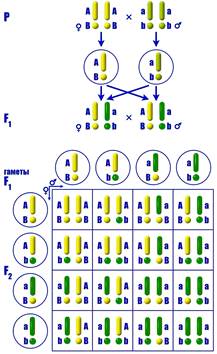 3). Вероятность образования зиготы c генотипом Аа равна 2/4 (АА + 2Аа + аа). BВ – 1/4. Значит, вероятность образования генотипа АаВВ равна 2/4 х 1/4 = 2/16. Цитологические основы третьего закона Менделя. Пусть А – ген, обусловливающий развитие желтой окраски семян, а – зеленой окраски, ген В отвечает за гладкую форму семени, в – за морщинистую. Гены находятся в разных парах гомологичных хромосом, палочковидных и округлых (рис. 195). Во время мейоза в гамету попадает одна хромосома из пары и гомозиготы образуют один тип гамет с хромосомами содержащими гены А и В или гаметы с хромосомами содержащими гены а и в. Гетерозиготы образуют четыре сорта гамет в одинаковом количестве (по 25 %): АВ, Aв, aB, aв. Во время оплодотворения каждый из четырех типов сперматозоидов может оплодотворить любую из четырех типов яйцеклеток. В результате оплодотворения возможно появление девяти генотипических классов, которые дадут четыре фенотипических класса.