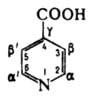 Изоникотиновая кислота (4-пиридинкарбоновая кислота, g-пиридинкарбоновая кислота), мол. м. 123, 11; бесцв. кристаллы. т. пл. 323-5 °С (с разл.) в запаянном капилляре, т. кип. 260°С/15 мм рт.ст. (с возг.); раств. в холодной (1: 100) и кипящей (1: 50) воде, не раств. в диэтиловом эфире. этаноле. ацетоне. р Ка при 25 °С в воде 1, 70 (присоединение протона) и 4, 89 (отщепление протона).