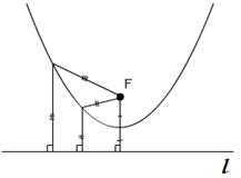 Определение 21. Параболой называется геометрическое место точек плоскости, для которых расстояние до некоторой фиксированной точки F этой плоскости равно расстоянию до некоторой фиксированной прямой l, также расположенной в этой плоскости (И, П, стр. 147). На рисунке 10 (https://desyatbukv.blogspot.ru/2012/01/blog-post_13.html) представлена кривая, удовлетворяющая данному определению.
