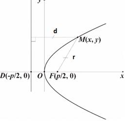 Так как в случае, если Для вывода канонического уравнения параболы систему координат введем следующим образом (А, стр. 71; И, П, стр. 147). Обозначим точку пересечения фокальной оси и директрисы точкой D (рисунок). Начало О декартовой системы координат выберем в середине отрезка Пусть длина отрезка DF равна р,