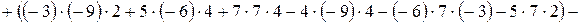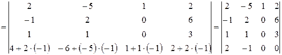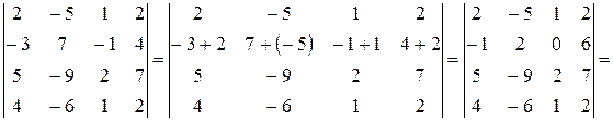 Очевидно, что выбор столбца или строки, по которым ведется разложение, в данном случае не имеет принципиального различия, так среди элементов нет нулевых, и при любом выборе расчет сведется к вычислению четырех определителей третьего порядка. 2 способ. Предварительно преобразуем исходный определитель, а точнее добьемся того, чтобы все элементы в третьем столбце за исключением одного оказались равными нулю. Для чего к элементам второй строки прибавим элементы первой строки, к элементам третьей строки прибавим элементы первой строки, умноженные на (-2) и затем к элементам четвертой строки прибавим элементы первой строки, умноженные на (-1). Согласно теореме 9 величина определителя при этом не изменится. Запишем расчеты, выполняя указанные действия последовательно.