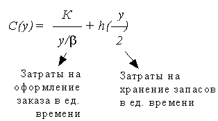 Предполагается, что интенсивность спроса (в единицу времени) равна b. Наивысшего уровня запас достигает в момент поставки заказа размером y (предполагается, что запаздывание поставки является заданной константой). Уровень запаса достигает нуля спустя у /b единиц времени после получения заказа размером у. Чем меньше размер заказа у, тем чаще нужно размещать заказы. Однако при этом средний уровень запаса будет уменьшаться. С другой стороны, с увеличением размера заказов уровень запаса повышается, но заказы размещаются реже.