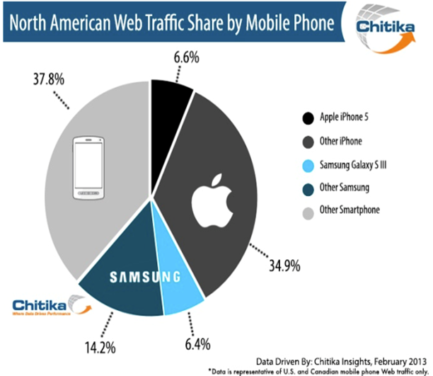 Рис. 1.2 Статистичний малюнок №1 Навіть незважаючи на успіх деяких окремих моделей смартфонів, наприклад, таких як LG / Google Nexus 4, добре видно, що основна битва розгорнулася між провідними вендорами - Samsung (Android) і Apple (iOS). Розробникам, які часто орієнтуються на технічні характеристики топових на ринку моделей смартфонів, можна підказати, що двома найбільш популярними в світі смартфонами на даний момент є Samsung Galaxy S3 і Apple iPhone 5. Їх поточне співвідношення сил можна виразити через інтернет-трафік, генерований ними в наступному співвідношенні: