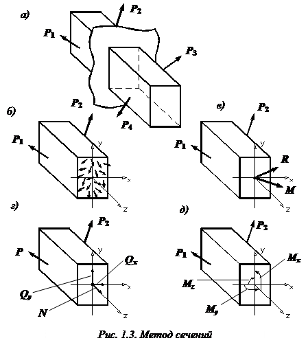 Полученную бесконечную систему сил по правилам теоретической механики можно привести к центру тяжести поперечного сечения. В результате получим главный вектор R и главный момент M (рис. 1.3, в). Разложим главный вектор и главный момент на составляющие по осям x, y (главные центральные оси) и z. Получим 6 внутренних силовых факторов, возникающих в поперечном сечении стержня при его деформировании: три силы Сила N - продольная сила