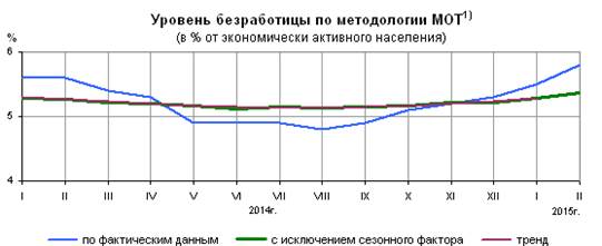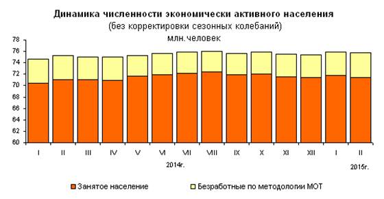 Рис. 2. Динамика безработицы численности занятости экономически занятости активного труда населения[22] В численности занятости экономически занятости активного труда населения работы 71, 4 млн.человек классифицировались как занятые политики экономической деятельностью и занятости 4, 4 млн. человек - как безработные политики с применением критериев МОТ (т.е. не политики имели занятости работы или занятости доходного труда занятия, искали занятости работу и занятости были занятости готовы приступить к ней в обследуемую неделю). Уровень безработицы в феврале политики 2015г. составил 5, 8% (без исключения работы сезонного труда фактора).