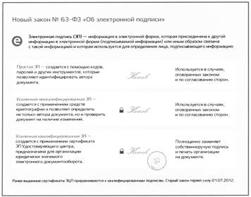 · закрепление права участников электронного взаимодействия использовать электронную подпись любого вида по своему усмотрению; · признание электронных подписей, созданных в соответствии с нормами права иностранного государства, электронными подписями того вида, признакам которого они соответствуют на основании нового закона; · необходимость прохождения аккредитации удостоверяющими центрами, которые предоставляют услуги по выдаче электронной подписи, на срок до пяти лет. Сразу хочется заметить, что старый закон полностью теряет силу 1 июля 2012 года. Начался переход к новой классификации электронных подписей. Итак, что обозначают новые виды электронной подписи?