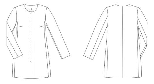 Пальто рекомендуется изготовлять размеров 92-100, ростов 158-170, I и II полнотных групп. Рисунок 30 – Эскиз модели А Модель Б (рис. 31) Демисезонное пальто для женщин младшей возрастной группы, из хлопчатобумажной ткани с содержанием синтетических волокон, для повседневной носки, полуприлегающего силуэта, базового покроя, стиля минимализм. Полочка с рельефами, выходящими из проймы и не проходящими через центр выпуклости груди. Спинка с рельефами, выходящими из проймы и не проходящими через экстремальные точки. Рукава втачные двухшовные. Воротник отсутствует, овальная конфигурация выреза горловины. Застежка однобортная на пять петель и пуговицы. Подкладка притачная по низу. Пальто рекомендуется изготовлять размеров 92-100, ростов 158-170, I и II полнотных групп.