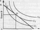 Кривая U1 пересекает бюджетную линию и поэтому является неоптимальным решением для потребителя. Двигаясь вдоль бюджетного ограничения, мы можем найти такую точку D, которая принадлежит кривой безразличия более высокого порядка U2 и в которой максимизируется благосостояние потребителя при данном бюджете. Кривая U3 является кривой более высокого порядка, чем U2, однако она выходит за пределы нашего бюджета и поэтому пока для нас недостижима.