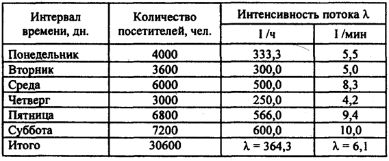 По приведенным данным поток посетителей в течение дня не постоянен: в разные часы работы магазина в него заходит разное количество посетителей, причем разность между максимальным и минимальным количеством посетителей, зашедших в магазин в течение часа, весьма существенна (от 100 до 1000 человек). Однако на ограниченном промежутке времени, например в течение часа, поток посетителей может считаться простейшим. Если к тому же длительности интервалов между двумя соседними событиями распределены по закону Пуассона, следовательно, можно вычислить интенсивность потока посетителей для каждого часа работы магазина, а также их среднее значение. Интенсивность потока посетителей в течение дня, как и количество посетителей магазина, является величиной непостоянной и изменяется в пределах от Рассмотрим распределение потока посетителей того же магазина, но уже в течение недели. Динамика потока посетителей представлена в табл. 3.6, в которой значения интенсивности являются усредненными характеристиками потока для каждого дня недели. Таблица 3.6