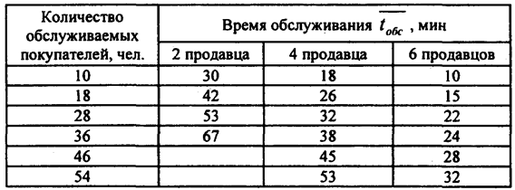 Следует отметить, что максимальные (минимальные) значения интенсивности потока, которые приведены в табл. 3.6 ( Изучение потока посетителей магазина помогает рационально организовать работу СМО, а также работу продавцов и кассиров в течение рабочего дня, добиться более равномерной загрузки торговых работников, повысить эффективность их труда. Рассмотрим характеристики потока обслуживания на примере работы секции по продаже радио- и телеаппаратуры. Результаты хронометража времени обслуживания покупателей разным числом продавцов в магазине представлены в табл. 3.7. Таблица 3.7