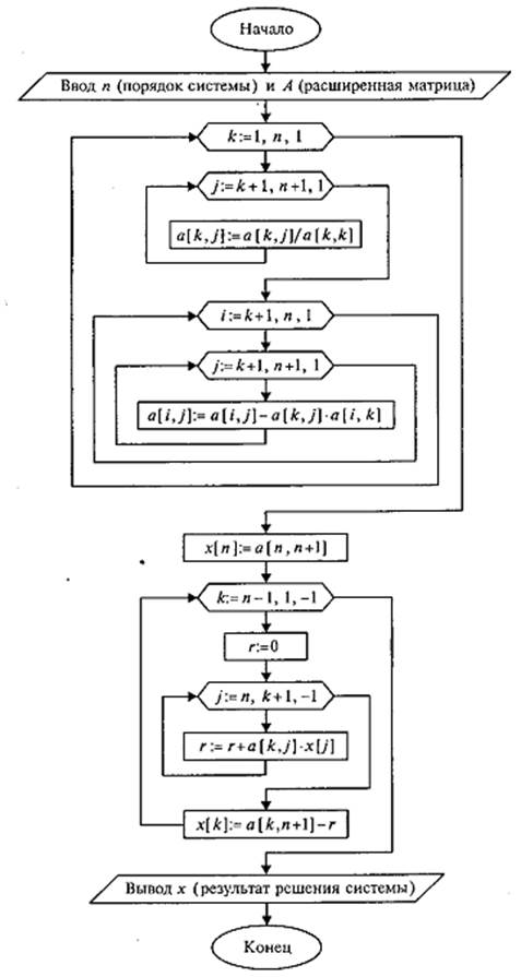 Program GAUS; Uses crt; var a: array [1..20, 1..21] of real; x: array [1..20] of real; r, aik: real; n, i, j, k, l: integer; Begin clrscr; {--------------- Ввод и вывод исходных данных -----------------} write(' Введи число неизвестных n='); readln(n); for i: =1 to n do for j: =1 to n+1 do Begin write(' a(', i, ', ', j, ')='); read (a[i, j]); if j=n+1 then writeln; End; writeln(' Коэффициенты системы уравнений '); for i: =1 to n do for j: =1 to n+1 do Begin if j=n+1 then writeln(' a(', i, ', ', j, ')=', a[i, j]: 8: 3) else write(' a(', i, ', ', j, ')=', a[i, j]: 8: 3); End; {--------------------- Прямой ход метода Гаусса -----------------} for k: =1 to n-1 do Begin for i: =k+1 to n do for j: =k to n+1 do Begin if j=k then aik: =a[i, k]; a[i, j]: = a[i, j] - (aik/a[k, k]) * a[k, j]; End; End; {--------------------- Обратный ход метода Гаусса -----------------} x[n]: =(a[n, n+1])/a[n, n];