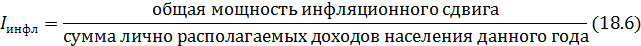 Под мощностью инфляционного сдвига в расходах населения на товары и услуги понимается абсолютная стоимостная оценка снижения покупательной силы денег, избыточные сбережения и скрытый рост цен за счет снижения качества товаров. Важное значение для оценки инфляционных процессов имеет сравнительный анализ динамики цен с динамикой ряда показателей: соотношение денежной и товарной массы, темпов роста денежной эмиссии, темпов роста доходов, относительной дефицитности бюджета и ВВП и др.