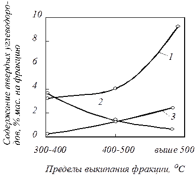 Р и с. Зависимость группового химического состава твердых углеводородов масляных фракций туймазинской девонской нефти от пределов их выкипания: 1 – нафтеновые; 2 – парафиновые; 3 – ароматические