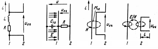а) б) в) г) Рис. 3.1. а) гальваническая связь (полное сопротивление связи); б) емкостная связь (поле Е); в) индуктивная связь (поле Н);
