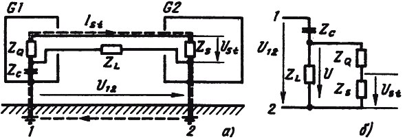 Рис. 3.2. Гальваническое влияние через разомкнутую петлю заземлений: а – схема устройства; б – схема, поясняющая формирование напряжений помехи Ust