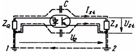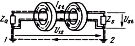 Два прибора G1 и G2 пространственно разделены друг от друга. Контур полезного сигнала заземлен в двух точках у корпусов приборов. По условиям техники безопасности корпуса приборов должны быть заземлены, а общие шины сигнального контура соединяются с корпусом прибора (рис. 3.2.). Между точками 1 и 2 может возникнуть разность потенциалов из–за тока в контуре заземления (однофазное короткое замыкание, удар молнии). Эта разность потенциалов U12 вызывает ток помехи Ist, который обуславливает величину помехи Ust.