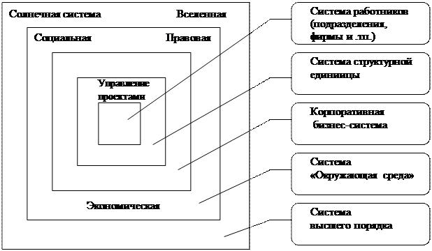 Рис. 1.1.3. Иерархия систем В ряде отраслей, таких, как авиационно-космическая или оборонная промышленность, создаваемые объекты являются настолько сложными, что работа над ними осуществляется не в составе проектов, а в составе Программ, которые можно определить как совокупность проектов или проект, отличающийся особой сложностью создаваемой продукции и/или методов управления его осуществлением. При таком подходе термин " проект", как правило, связывается с относительно краткосрочными целями. В настоящее время в Российской Федерации разработан и реализуется ряд программ развития: топлива и энергетики, продовольствия, транспорта и связи, жилья, машиностроения и др. В число приоритетных федеральных программ вошли программы энергоснабжения, электрификации и газификации сельских районов, повышения безопасности атомной энергетики, использования нетрадиционных источников энергии, освоения газовых месторождений полуострова Ямал, развития Канско-Ачинского топливно-энергетического комплекса. Концептуально важным является понятие системы, которое может быть определено следующим образом: " Система — это группа элементов (включающих как людей, так и технические элементы), организованных таким образом, что они в состоянии действовать как единое целое в целях достижения поставленных перед ними целей" (рис. 1.1.3). В качестве примеров таких систем можно привести «Компанию " Аэрофлот"», " Систему спутникового телевидения" и т.д. Соответственно программы являются подсистемами первого уровня (нетрудно привести примеры программ Аэрофлота и др.), а проекты представляют собой часть программ.