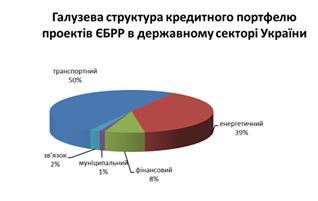Галузева структура кредитного портфелю проектів ЄБРР в державному секторі економіки складається таки чином, що 50% всього портфелю кредитів спрямовані на фінансування проектів розвитку транспортної інфраструктури, 39 % на підтримку проектів в енергетичній сфері, інші у фінансовий (8%), зв'язок (2%) та розвиток муніципалітетів (1%).