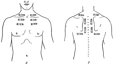 Рис.21. Схема сравнительной перкуссии легких: а – по передней, б – по задней поверхности грудной клетки
