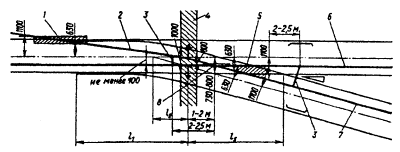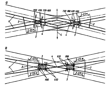 Воздушная стрелка – образуется двумя сходящимися у стрелки линиями контактной сети; служит для направления токоприемника (пантографа, бугеля) при переходе электроподвижного состава с одного пути на другой. Для гарантирования надежной работы В. с. образующие ее контактные провода в месте их пересечения оборудуются крестовыми накладками, обеспечивающими одновременный подъем обоих проводов при подъеме пантографом одного из них. Воздушные стрелки должны обеспечивать плавный, без ударов и искрений переход полоза токоприемника с контактных проводов одного пути (съезда) на контактные провода другого, свободное взаимное перемещение подвесок, образующих воздушную стрелку, и минимальное взаимное вертикальное перемещение контактных проводов в зоне подхвата полозом токоприемника провода примыкающего пути. Воздушные стрелки над обыкновенными и перекрестными стрелочными переводами и над глухими пересечениями путей должны быть фиксированными с обеспечением возможности взаимных продольных перемещений контактных проводов. На второстепенных путях допускается применять нефиксированные воздушные стрелки. На воздушных стрелках контактные провода главных путей или путей преимущественного направления движения поездов должны быть расположены снизу. Пересечение контактных проводов, образующих воздушную стрелку при обыкновенном стрелочном переводе, должно отстоять от осей прямого и примыкающего путей на 360 - 400 мм и находиться в том месте, где расстояние между внутренними гранями головок соединительных рельсов составляет 730 - 800 мм (рисунок 2.8.1). При перекрестном стрелочном переводе контактные провода пересекающихся путей должны иметь двойное (ромбовидное) пересечение в том месте, где расстояние между внутренними гранями головок соединительных рельсов составляет 730 - 800 мм (рисунок 2.8.2а). Допускается одинарное пересечение контактных проводов над центром пересечения осей путей. При глухом пересечении путей контактные провода располагают над центром пересечения осей путей (рисунок 2.8.2б). Зона подхвата полозом токоприемника контактных проводов примыкающего или пересекающего пути и зона прохода полоза токоприемника электроподвижного состава под нерабочими ветвями контактных проводов должны располагаться на расстоянии 630 - 1100 мм от оси пути. Для одновременного подъема контактных проводов обоих путей в месте их пересечения устанавливают ограничительные накладки длиной 1, 5 м при марке крестовины 1/9 и круче, 1, 7 м - при марке крестовины 1/11 и 2, 0 м - при марке крестовины 1/18 и плавнее. Расстояние между ограничительной накладкой и контактным проводом, на котором она установлена, должно быть 13 - 15 мм. Ограничительные накладки устанавливают на каждый контактный провод, расположенный снизу. Головки болтов фиксирующих зажимов, крепящих ограничительную накладку, должны быть обращены к контактному проводу примыкающего пути. Пересечение контактных проводов при среднегодовой температуре воздуха данного температурного района должно располагаться в средней части ограничительной накладки. За зоной подхвата полозом токоприемника контактных проводов на расстоянии не более 1 м в сторону крестовины должны быть установлены двойные вертикальные или скользящие струны. Если расстояние между струнами с двух сторон пересечения превышает д