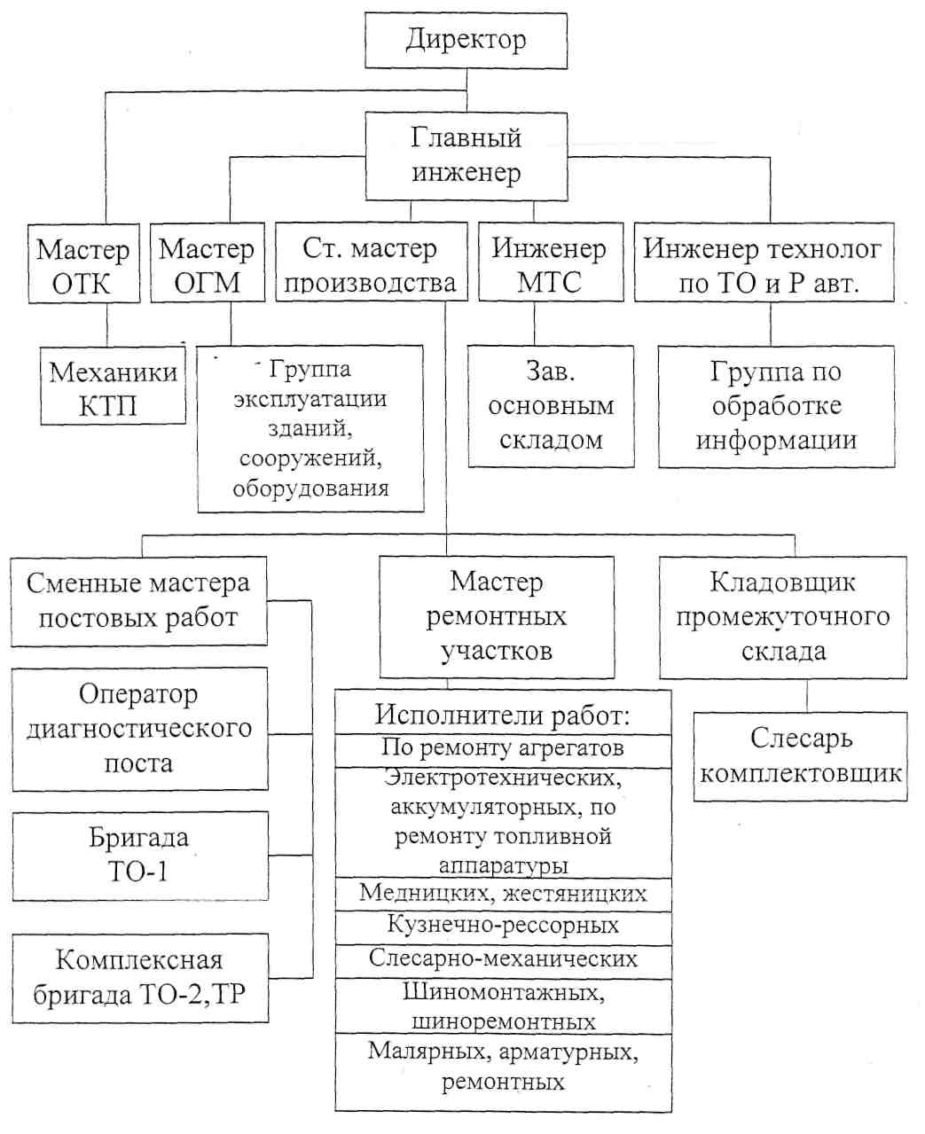 1. Управление процессом ТО и ремонта подвижного состава в СТО осуществляется директором. 2. Организация ТО и ремонта в АТП основывается на технологическом принципе формирования производственных подразделений (комплексов), при котором каждый вид технического воздействия (ЕО, ТО-1, ТО-2, Д-1, Д_2, ТР автомобилей, ремонт агрегатов) выполняется специализированными подразделениями. 3. Подразделения (бригады, участки и исполнители), выполняющие однородные виды технических воздействий, для удобства управления ими объединяются в производственные комплексы: --- комплекс технического обслуживания и диагностики (ТОД); --- комплекс текущего ремонта (ТР); --- комплекс ремонтных участков (РУ). 4. Подготовка производства (комплектование оборотного фонда, доставка агрегатов, узлов и деталей на рабочие места и с рабочих мест, обеспечение рабочим инструментом, перегон автомобилей в зонах ожидания ТО и ремонта и т.д.) осуществляется централизованно комплексом подготовки производства (КПП). 5. Обмен информацией между отделом управления и всеми производственными подразделениями базируется на двусторонней диспетчерской связи, средствахавтоматики и телемеханики. Схема централизованного управления производством и пример схемы управления объектом проектирования при методе технологических комплексов приведена в Приложении 4 Методических указаний.