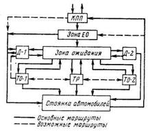 В этих маршрутах принципиально важным является необходимость ожидания автомобилей очереди перехода его от предыдущего этапа ТО или ТР к последующему, что является следствием неодинаковой потребности автомобиля в различных видах воздействия и неравномерности их поступления в те или иные зоны ТО и ТР. Поэтому практически необходимость ожидания возникает не всегда и не у каждого автомобиля. Однако, несмотря на случайный характер ожидания, рациональная планировка предприятия должна по возможности обеспечивать независимое прохождение автомобилем любого самостоятельного маршрута. Это достигается в первую очередь соответствующим взаимным расположением зон и организацией движения между ними (рис. 5.4). При этом расположение каждой зоны должно быть достаточно универсальным.