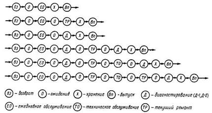 Количественную характеристику этого процесса, т. е. мощность суточных потоков, проходящих различные этапы производства (в единицах подвижного состава), отражает график производственного процесса (рис. 5.2). Схема и график способствуют рациональному размещению основных зон (хранения, ЕО, ТО – 1, ТО – 2 и ТР) и организации движения.