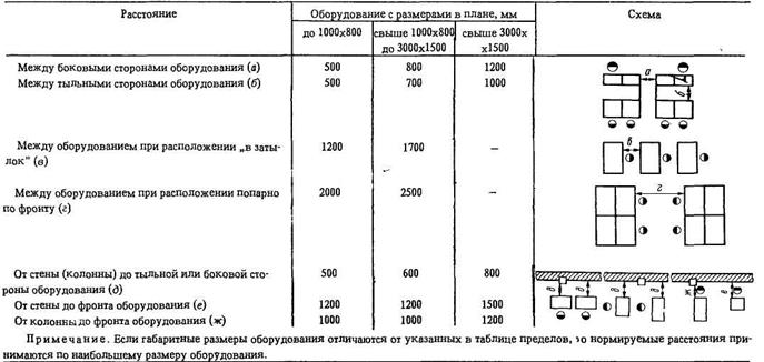 Рис. 4.2. Схемы планировки зоны ТО и ТР при тупиковом расположении постов: S – ширина проезда; a – угол установки относительно проезда Лек 6Технологическая планировка производственных участков Однородный характер некоторых работ, выполняемых на производственных участках, например жестяницких и сварочных, предъявляет к ним одинаковые строительные, противопожарные и санитарно – гигиенические требования. Поэтому для исключения раздробленности здания на мелкие помещения целесообразно совмещение такого рода работ и, следовательно, участков в одном помещении. Кроме того, при небольшой производственной программе, когда площади помещений для выполнения отдельных видов работ составляют менее 10 м2, необходимо также совмещать однородные работы. В соответствии с ОНТП для выполнения отдельных видов работ ТР с учетом их противопожарной опасности и санитарных требований следует предусматривать отдельные помещения для следующих групп работ (или отдельных видов работ, входящих в группу): а) агрегатных, слесарно – механических, электротехнических и радиоремонтных работ, работ по ремонту инструмента, ремонту и изготовлению технологического оборудования, приспособлений и производственного инвентаря; б) испытания двигателей; в) ремонта приборов системы питания карбюраторных и дизельных двигателей; г) ремонта аккумуляторных батарей; д) шиномонтажных и вулканизационных работ; е) таксометровых работ; ж) кузнечно – рессорных, медницких, сварочных, жестяницких и арматурных работ; з) деревообрабатывающих и обойных работ; и) окрасочных работ. Расстановка оборудования на участках должна выполняться с учетом необходимых условий техники безопасности, удобства обслуживания и монтажа оборудования при соблюдении нормативных расстояний между оборудованием, между оборудованием и элементами зданий. Для относительно простого оборудования (разборочные и сборочные стенды, верстаки и т. п.), не требующего фундаментов или устанавливаемого на фундаменты, габариты в плане которого мало отличаются от габаритов самого оборудования, а также для оборудования, не требующего сложных сантехнических и энергетических устройств, нормативные расстояния приведены в табл. 4.3. Таблица 4.3. Нормируемые расстояния для размещения слесарного оборудования, мм