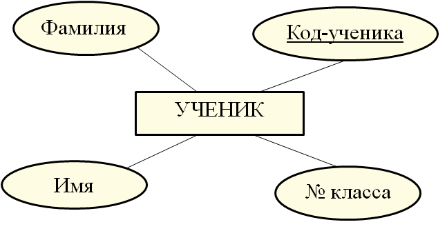 Сущность – реальный или воображаемый объект, имеющий существенное значение для рассматриваемой предметной области, информацию о котором необходимо хранить в базе данных. Сущностями могут быть люди, места, самолеты, рейсы, вкус, цвет и т.д. В ER-модели сущность изображается прямоугольником, внутри которого записывается имя сущности (Рис. 5). Имя сущности определяет тип или класс вещей, а не отдельный экземпляр, и, как правило, представляет существительное в единственном числе. Например, существительное «ученик» представляет класс детей, которые ходят в школу. У каждой сущности есть экземпляры – конкретные представители данной сущности. Экземпляры сущности должны быть различимы, т.е. должны иметь некоторые свойства, значения которых уникальны для каждого экземпляра. У каждой сущности есть набор свойств, которые называются атрибутами. Атрибутсущности – поименованная характеристика сущности. Атрибуты используются для определения того, какая информация должна быть собрана о сущности. Атрибут определяется типом (число, текст, логика и др.) и значением, которое он принимает. В модели атрибуты обозначаются овалами, внутри которых указывается имя атрибута (Рис.5). Уникальность экземпляров сущности обеспечивается ключом. Ключ сущности – это минимальный набор атрибутов, значения которых однозначно определяют любой экземпляр сущности. Ключевые атрибуты выделяют подчеркиванием внутри овала (Рис. 5). Рис.5. Изображение сущности с атрибутами