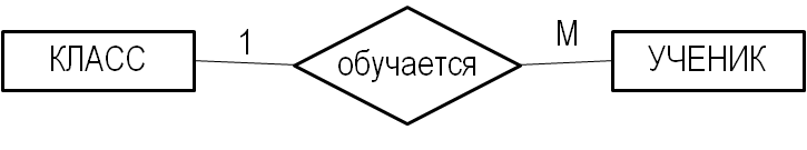 Между двумя сущностями различают следующие виды связей: один-к-одному, один-ко-многим, многие-к-одному, многие-ко-многим. Для определения типа связи между сущностями строят два предложения, которые образуются при прочтении диаграммы модели от одной сущности к другой и наоборот. Предложения создаются следующим образом: на первом месте идет название одного экземпляра сущности, затем связь, затем число связанных экземпляров (кардинальность) и, наконец, название другой сущности (рис.7). Рис. 7. Определение типа связи между двумя сущностями " Класс" и " Ученик"