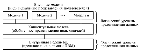 Концептуальная модель представляет собой интегрированные концептуальные требования всех пользователей к базе данных данной предметной области. При этом усилия разработчика должны быть направлены в основном на структуризацию данных, принадлежащих будущим пользователям БД и выявление взаимосвязей между ними. Возможно, что отраженные в концептуальной модели взаимосвязи между объектами окажутся впоследствии нереализуемыми средствами выбранной СУБД, что потребует ее изменения. Версия концептуальной модели, которая может быть реализована конкретной СУБД, называется логической моделью. Логическая модель, отражающая логические связи между атрибутами объектов вне зависимости от их содержания и среды хранения, может быть реляционной, иерархической или сетевой. Таким образом, логическая модель отображает логические связи между информационными данными в данной концептуальной модели. Различным пользователям в информационной модели соответствуют различные подмножества ее логической модели, которые называются внешними моделями пользователей. Таким образом, внешняя модель пользователя представляет собой отображение его концептуальных требований в логической модели и соответствует тем представлениям, которые этот пользователь получает о предметной области на основе логической модели. Следовательно, насколько хорошо спроектирована внешняя модель, настолько полно и точно информационная модель отображает предметную область и настолько полно и точно работает автоматизированная система управления этой предметной областью. Логическая модель отображается в физическую память, которая может быть построена на электронных, магнитных, оптических, биологических или других принципах. Внутренняя модель предметной области определяет размещение данных, методы доступа к ним и технику индексирования в данной логической модели и иначе называется физической моделью. Информационные данные любого пользователя в БД должны быть независимы от всех других пользователей, т. е. не должны оказывать влияния на существующие внешние модели. Это положение отражает первый уровень независимости данных. С другой стороны, внешние модели пользователей никак не связаны с типом физической памяти, в которой будут храниться данные, и с физическими методами доступа к этим данным. Это положение отражает второй уровень независимости данных.