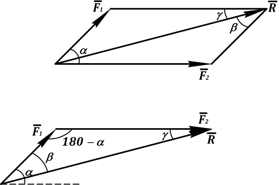 Рис. 38. Сложение двух сходящихся сил Из тригонометрии известно (рис. 39)
