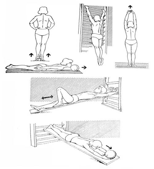 Рис.5. Упражнения, направленные на вытяжение позвоночника. Ко второму относится активное вытяжение, которое достигается с помощью специальных упражнений. Например, «продвижение» туловища вперед из исходного положения лежа на животе, как бы вытягиваясь с подтягиванием подбородка вперед. Из исходного положения стоя, с опорой рук на тазовый пояс и вытягивание туловища вверх; стоя, поднимание рук вверх с колебательными движениями туловища, растягивая позвоночник (рис. 2). Вытяжение оказывает положительное действие при торсии позвоночника, препятствуя его развитию (рис.6).